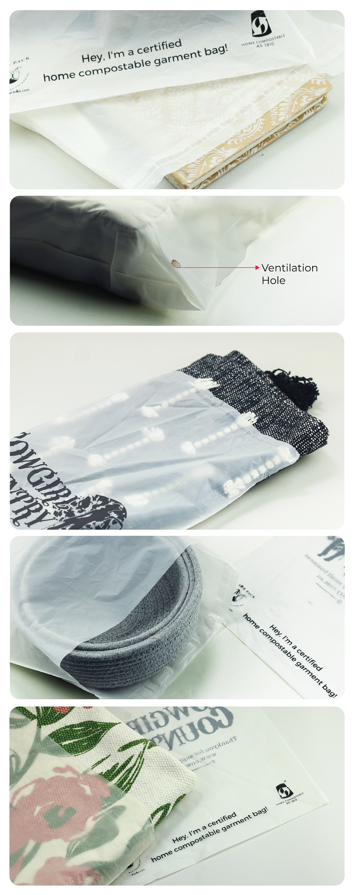 Custom garment bags are made of 20-30% PLA + cornstarch & 70-80% PBAT (an entirely compostable co-polymer).