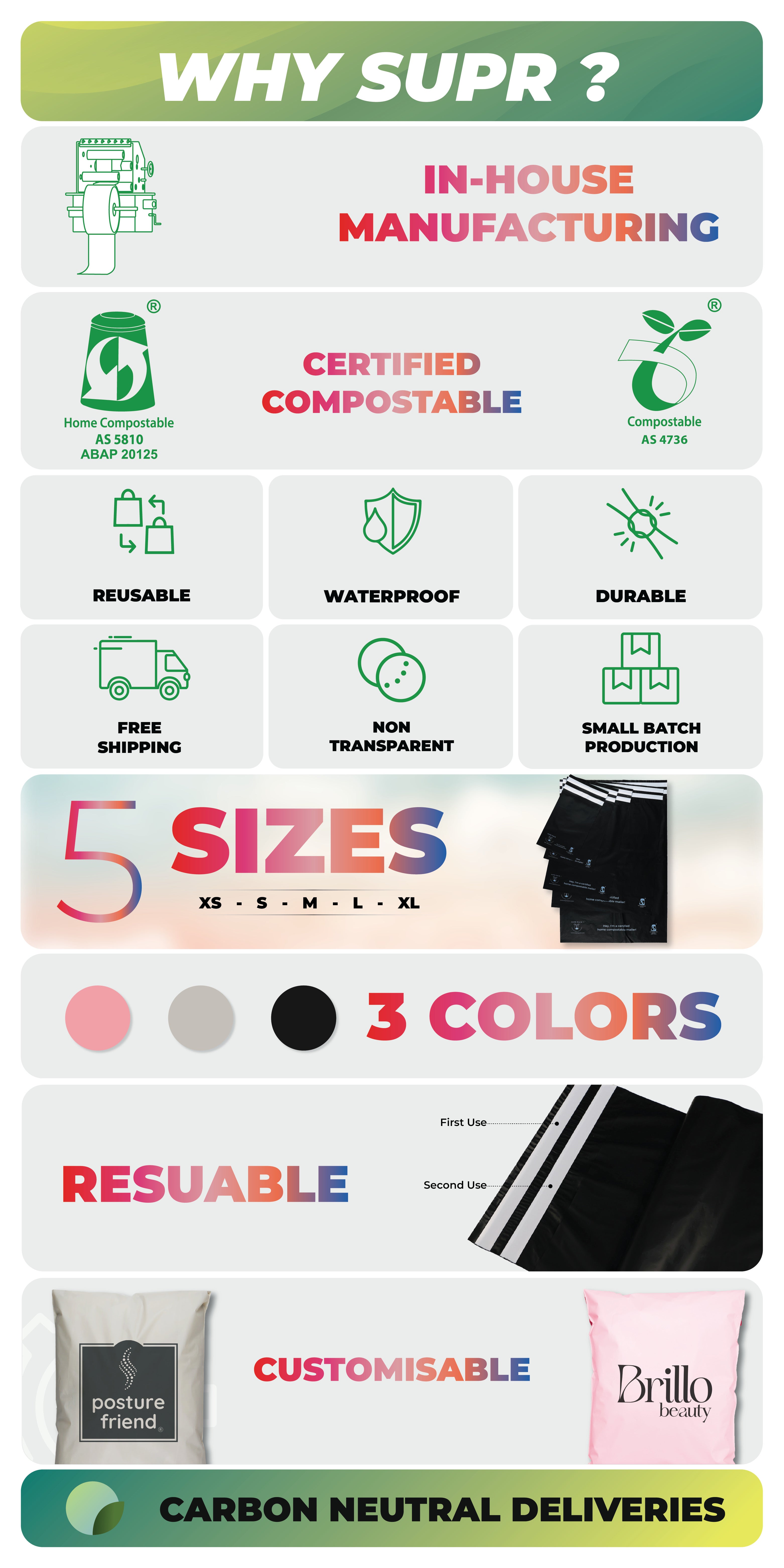 With an in-house manufacturing unit, Supr Pack offers carbon-neutral free shipping. For the benefit of the environment and brand, the custom mailers are AS5810 Home Compostable and AS4736 Commercially Compostable with the brand logo.