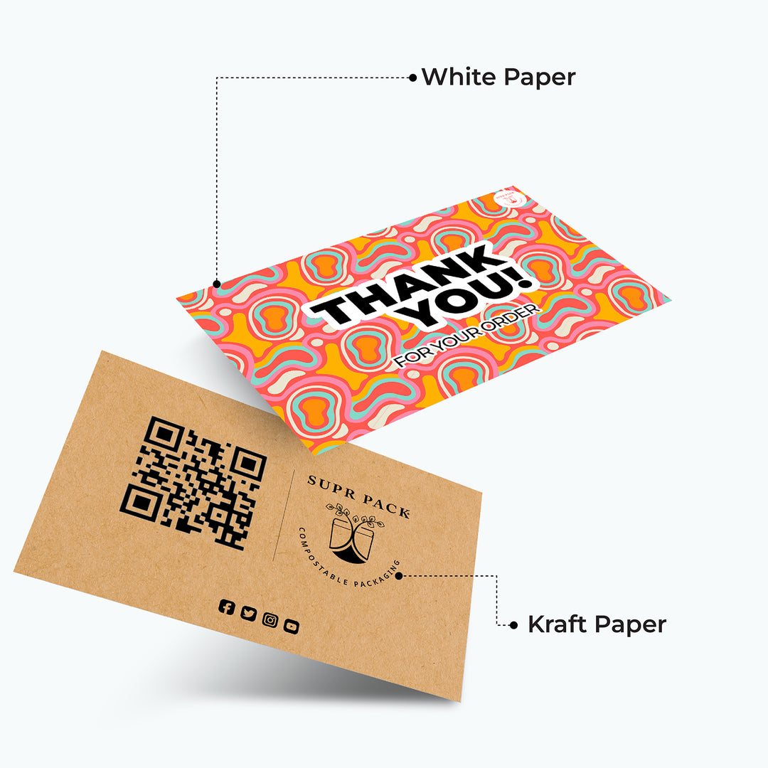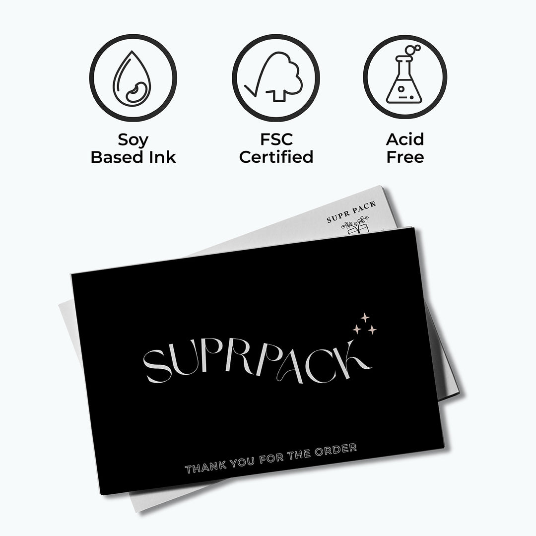 Supr Pack’s Custom Thank you cards are Eco-Friendly, FSC Certified, Acid-Free & use Soy based ink for printing & are a perfect way to express gratitude in your Compostable packaging where sustainability meets creativity