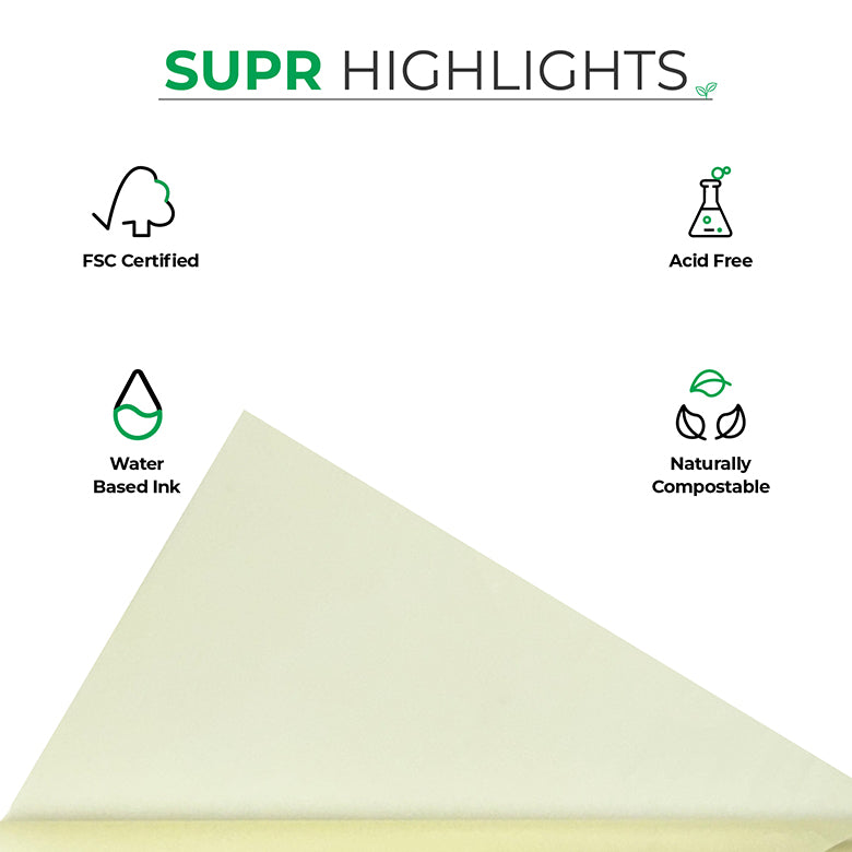 Tissue Paper from Supr Pack is FSC Certified, Acid Free, Naturally Compostable, manufactured from recycled paper and ideal for Sustainable Packaging. It can be composted in your home compost bin.