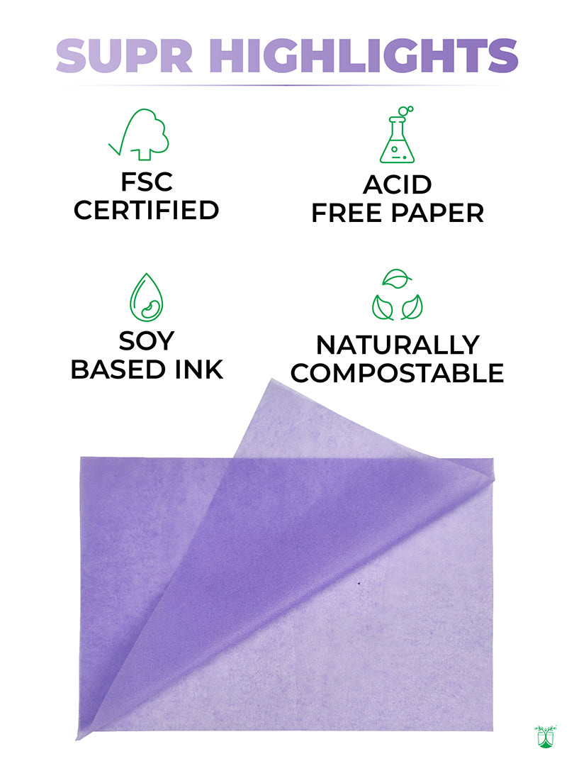 Add a soft touch to your packaging with our purple stock tissue paper. Supr Pack’s colored tissue paper lets you easily choose subtle sustainable footprints. The bulk tissue papers are Eco-friendly, Naturally Compostable, FSC Certified, and Acid-Free. The purple tissue papers are 17GSM thick, translucent, and non-coated.