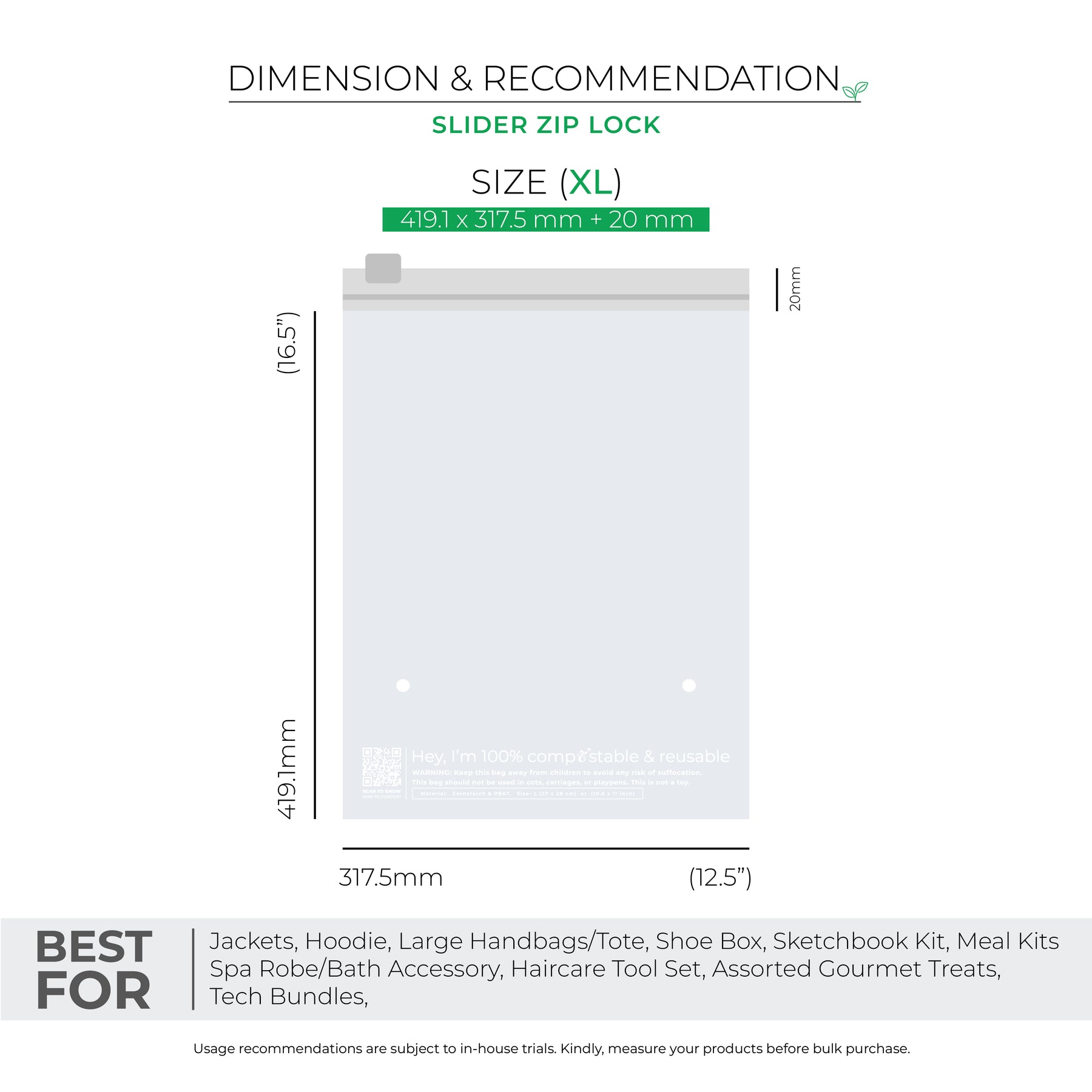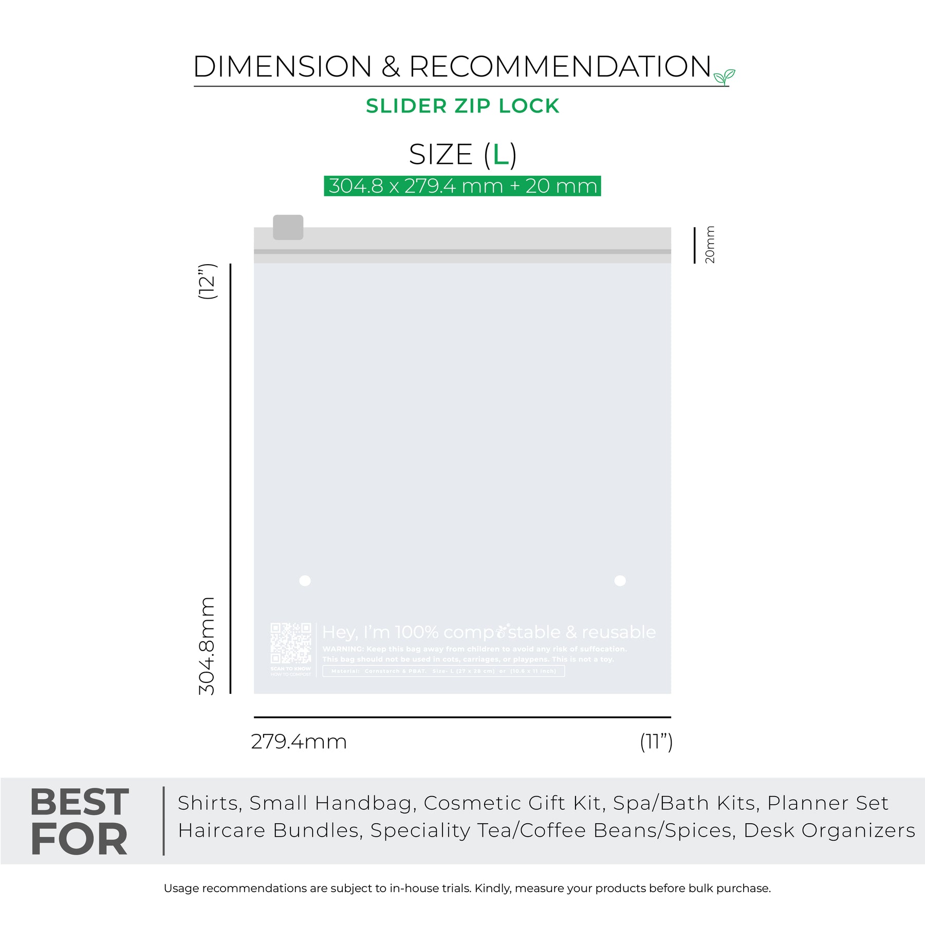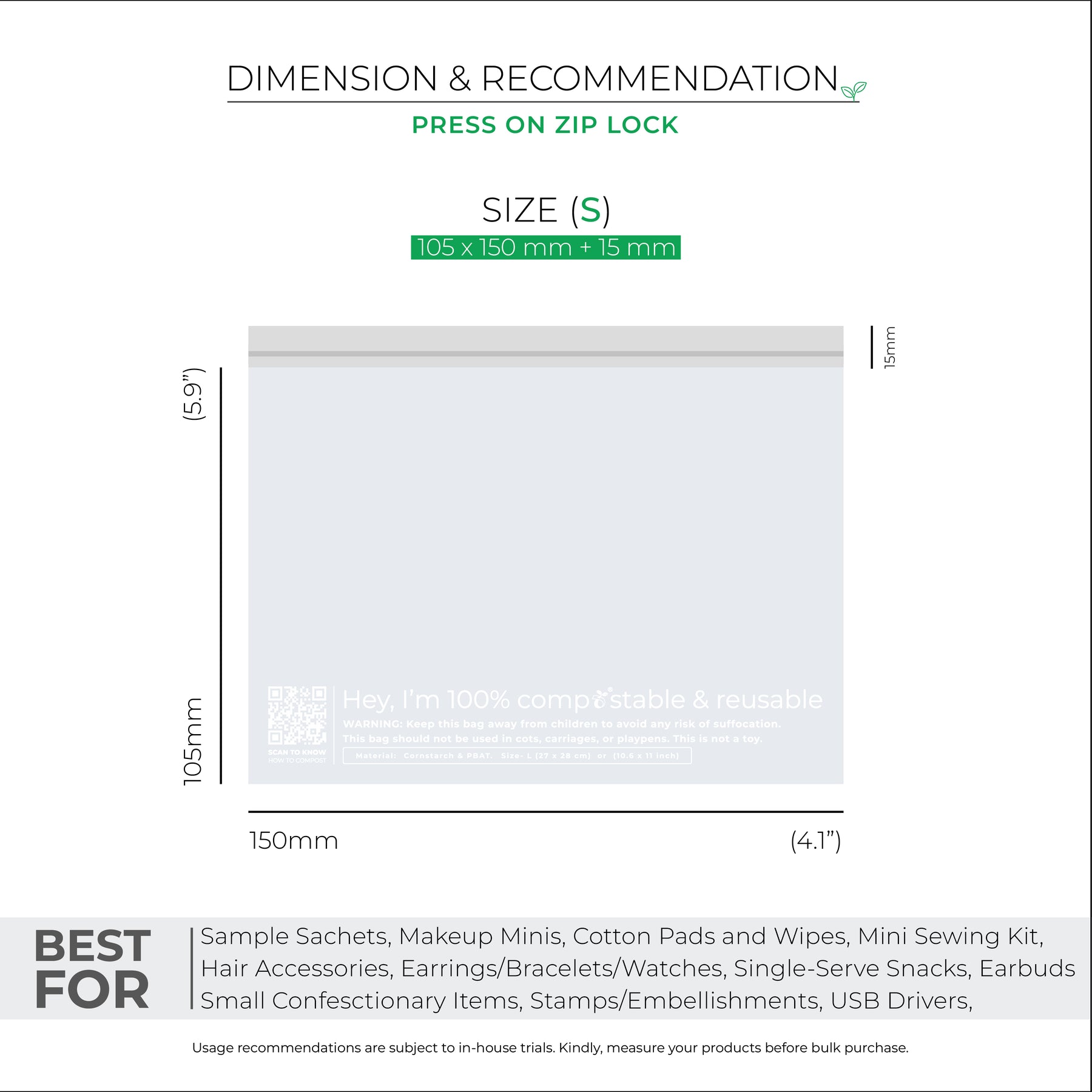 • Quality in Every Zip -  These are 100% industry compostable, biodegradable zip lock bags made from cornstarch  with a thickness of 50 microns.