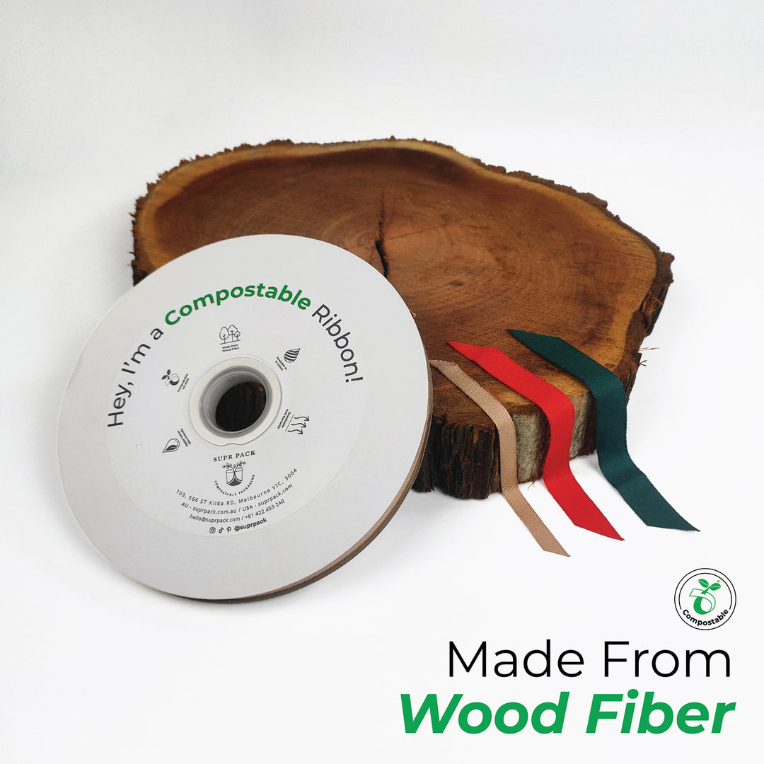 Supr Pack's Custom Ribbons, crafted from compostable wood fiber. Add a touch of natural elegance to your products while reducing your ecological footprint. Choose Supr Pack's Custom Ribbons for an environmentally conscious packaging solution.