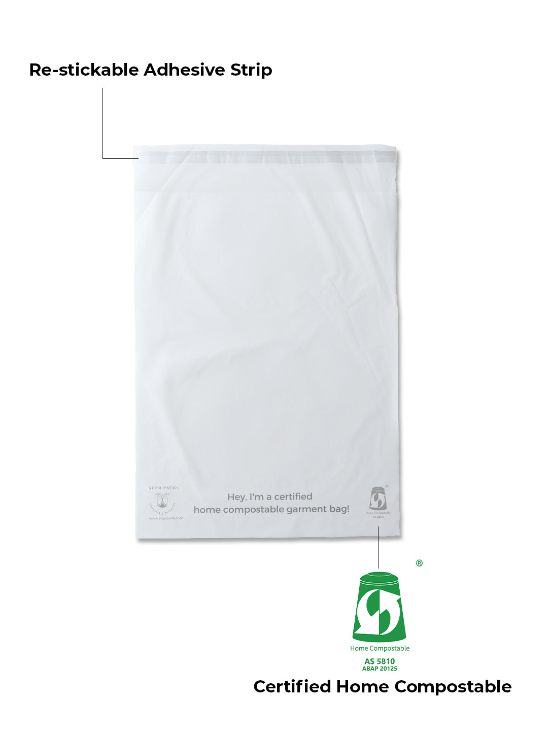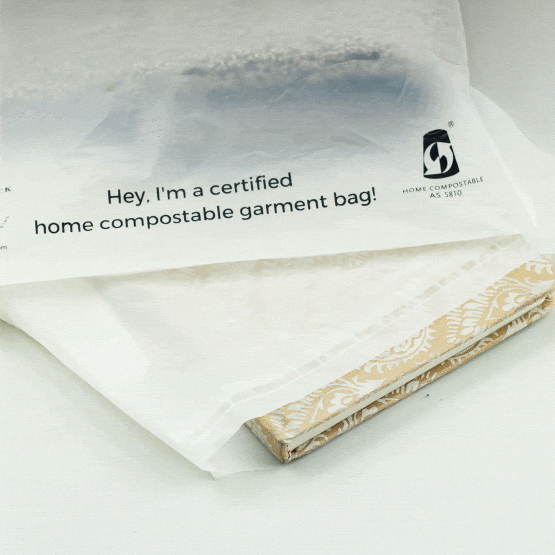 Custom garment bags are made of 20-30% PLA + cornstarch & 70-80% PBAT (an entirely compostable co-polymer).