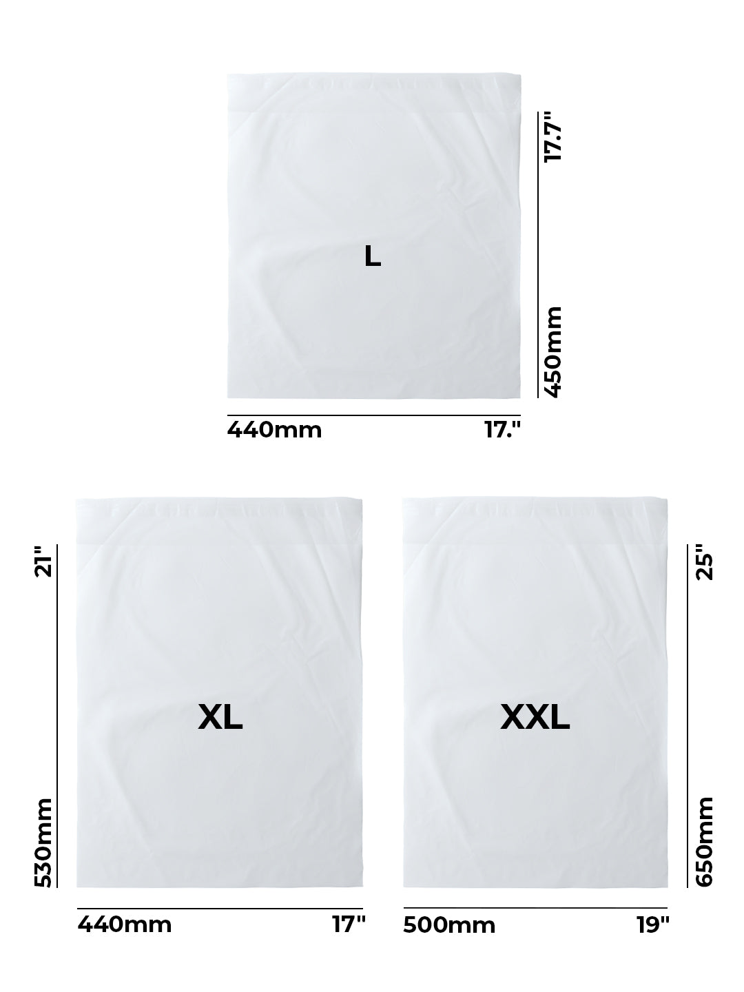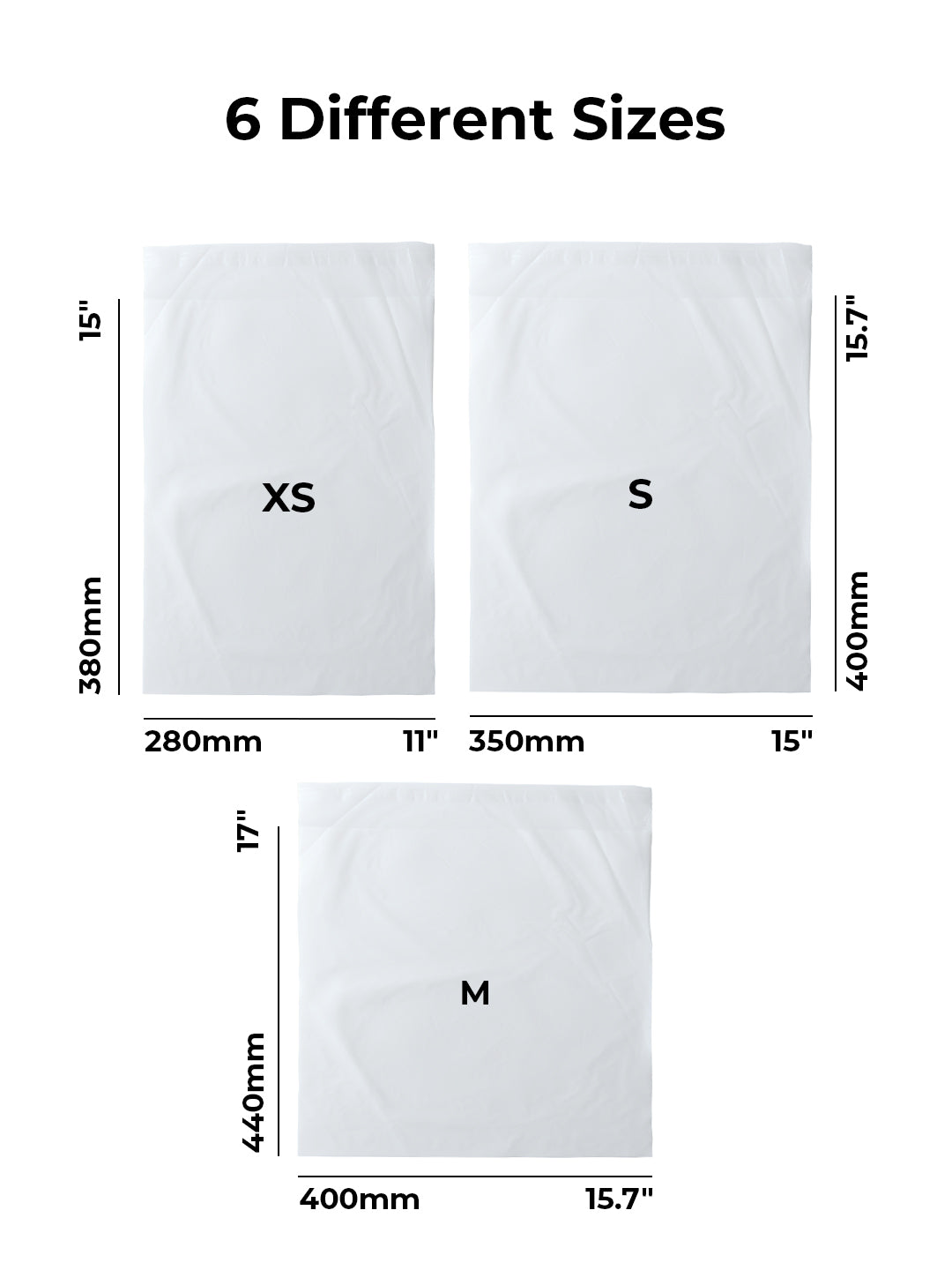 Custom Garment Bags are available in 6 different sizes to cater to all your product needs.